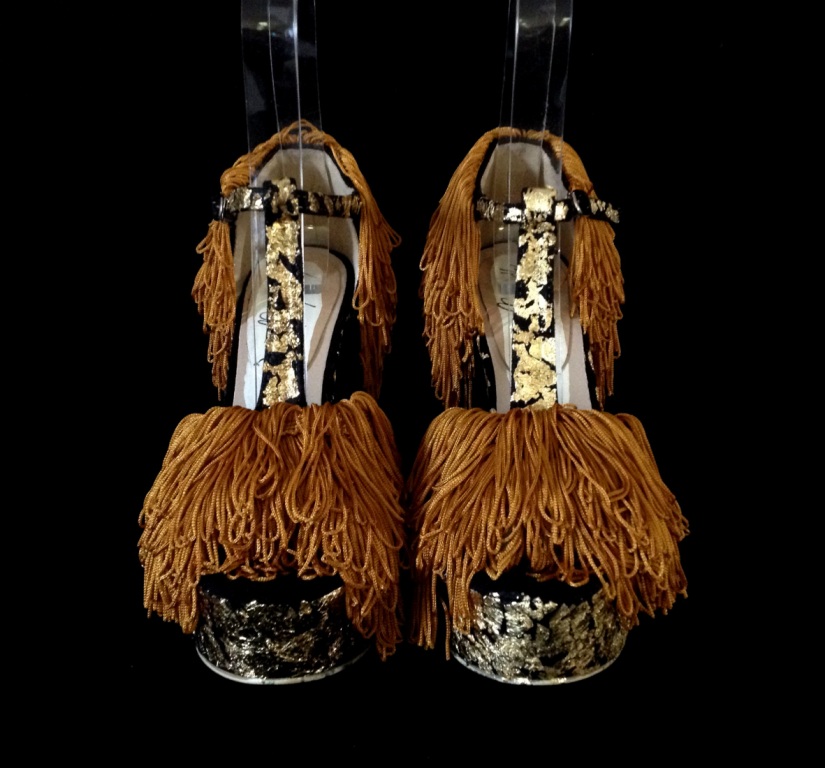 Bastardisation #15, 2014, gringes, studs, gold leaf and spray paint on sandal, size n37 unique piece Published April 1, 2014 at 825 × 768 in #15 Bastardisation Sculpture Shoes Collection Next → Bastardisation #15, 2014, gringes, studs, gold leaf and spray paint on sandal, size n37 unique piece