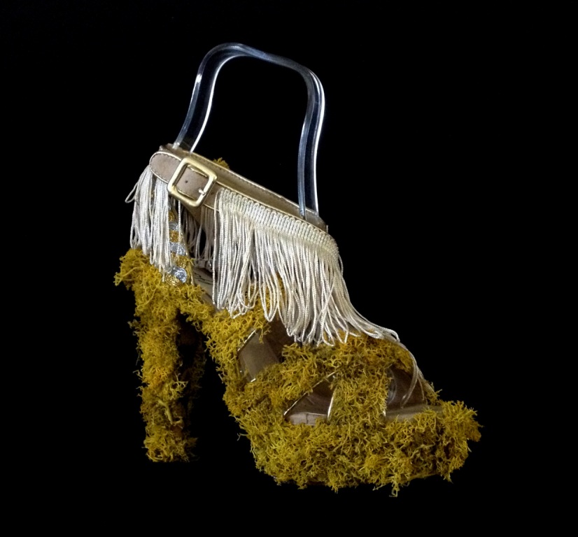 Bastardisation #23, 2014, fringes, golden decoration, Iceland’s moss and spray paint on cross string sandal, size n38, unique piece Published April 3, 2014 at 826 × 768 in #23 Bastardisation Sculpture Shoes Collection ← Previous Next → Bastardisation #23, 2014, fringes, golden decoration, Iceland’s moss and spray paint on cross string sandal, size n38, unique piece