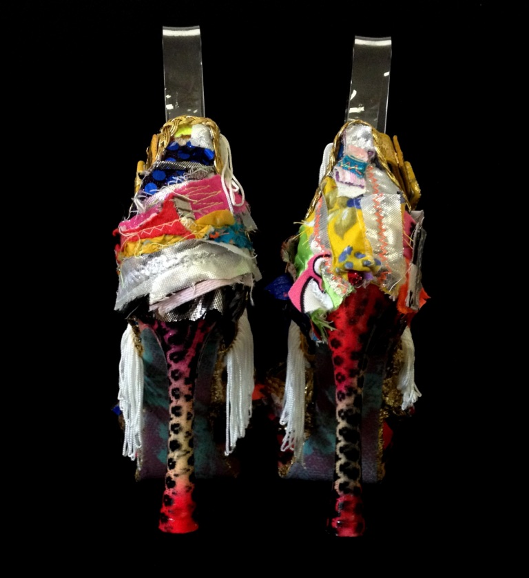 Bastardisation #24, 2014, fringes, tulle, fabric and golden decoration, bijou and spray paint on cross string sandal, size n36 unique piece Published April 3, 2014 at 768 × 840 in #24 Bastardisation Sculpture Shoes Collection ← Previous Next → Bastardisation #24, 2014, fringes, tulle, fabric and golden decoration, bijou and spray paint on cross string sandal, size n36 unique piece