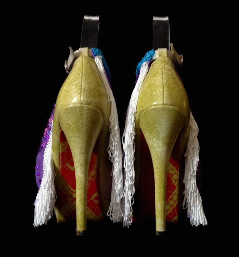 Daniel González_Bastardisation #27_2014 Published April 22, 2014 at 768 × 827 in #27 Bastardisation Sculpture Shoes Collection ← Previous Next → Daniel González_Bastardisation #27_2014_Indian silk, fringes ans spray paint on décolleté_n39_unique piece _ph Elena Girelli