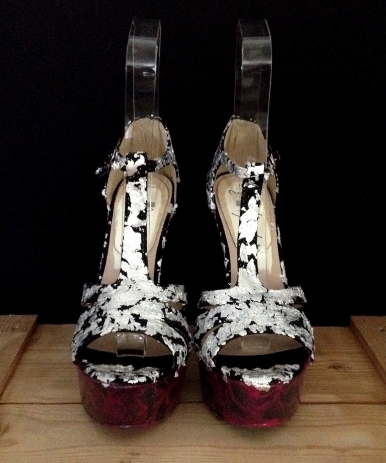 Bastardisation #37, 2014, silver leaf, spray paint and fringes on sandal pumps, size n37, unique piece Published May 12, 2014 at 768 × 922 in #37 Bastardisation Sculpture Shoes Collection ← Previous Next → Bastardisation #37, 2014, silver leaf, spray paint and fringes on sandal pumps, size n37, unique piece
