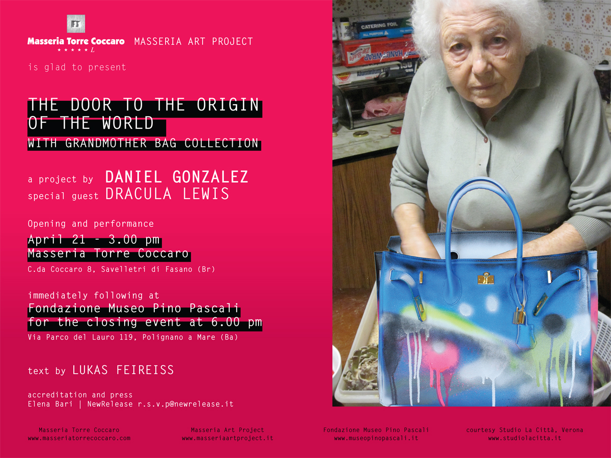 Per le celebrazioni del primo lustro del progetto è stato chiamato l’artista Argentino, di base a Berlino e New York, Daniel González che con un duplice evento domenica 21 aprile inaugura a Masseria Torre Coccaro l’installazione permanente The Door to the Origin of the World with Grandmother Bag Collection.