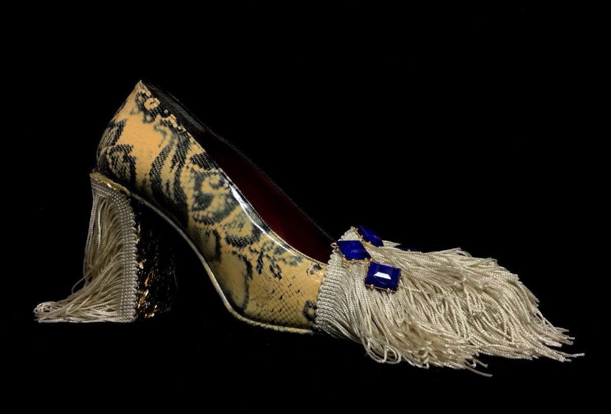 Daniel González, Bastardisation Collection #3, 2014 Published February 15, 2014 at 2922 × 1984 in SHOES ← Previous Next → Daniel González, Bastardisation Collection #3, 2014, gold leaf, spray paint, fringes and bijou on leather decollete shoes, n38 – unique piece, ph Elena Girelli